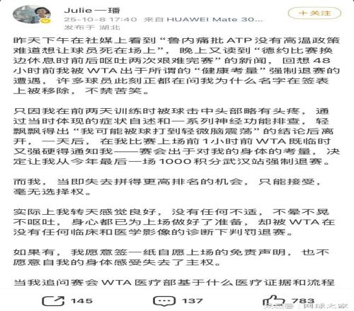 一位網友評論道:“如果運動員感覺良好卻無法參賽,這保護的是誰的利益?”但是也有網友表示理解:“腦震蕩潛在風險巨大,WTA謹慎行事無可厚非。”