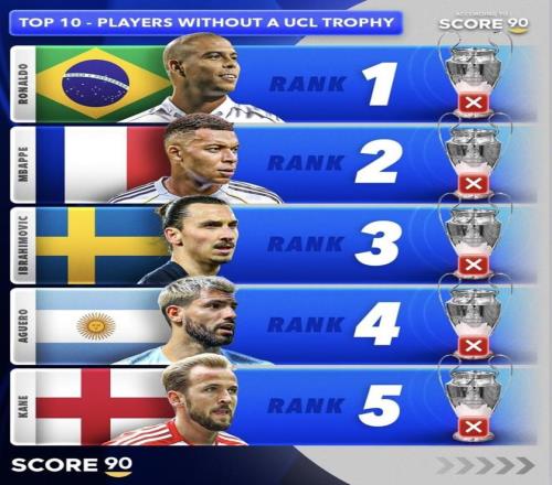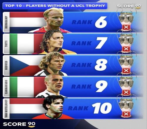 這是媒體Score 90評出的“歐冠無冠球星 TOP10”榜,羅納爾多、伊布、托蒂、內(nèi)德維德、凱恩、姆巴佩、范尼等大牌悉數(shù)在列,陣容耀眼,卻都缺少一座“大耳朵杯”。同樣是時代巨星,為何有人距離冠軍只差一步,有人則被球隊周期“錯峰”?