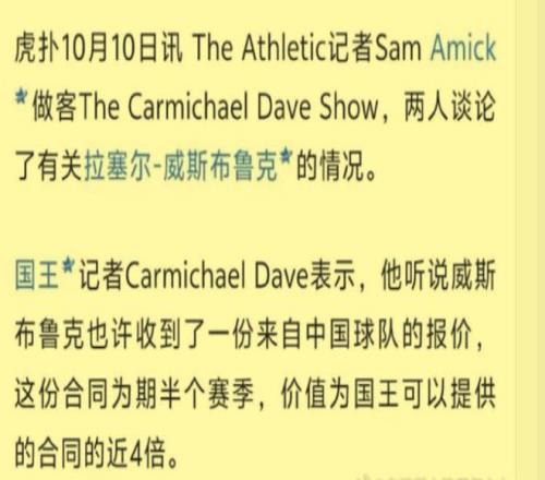 而根據(jù)NBA國王隊隨隊體育記者卡邁克爾-戴夫的最新爆料,他說威斯布魯克確定會來CBA聯(lián)賽效力,而且那支對威斯布魯克感興趣的CBA球隊的報價合同,竟然是國王隊能給他的年薪的4倍,這也太夸張了吧?